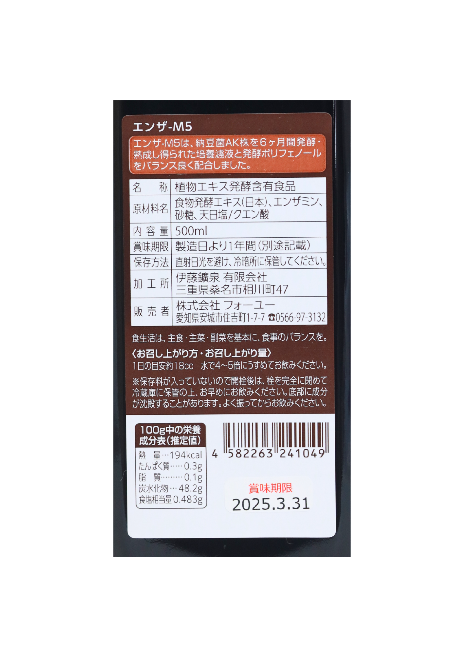 • 原材料:食物発酵エキス(日本製造)、エンザミン、砂糖、非加熱天日塩、クエン酸