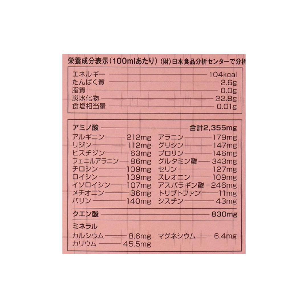 【その他の栄養成分】アミノ酸 合計2,355mg/クエン酸 830mg/カルシウム 8.6mg/カリウム 45.5mg/マグネシウム 6.4mg