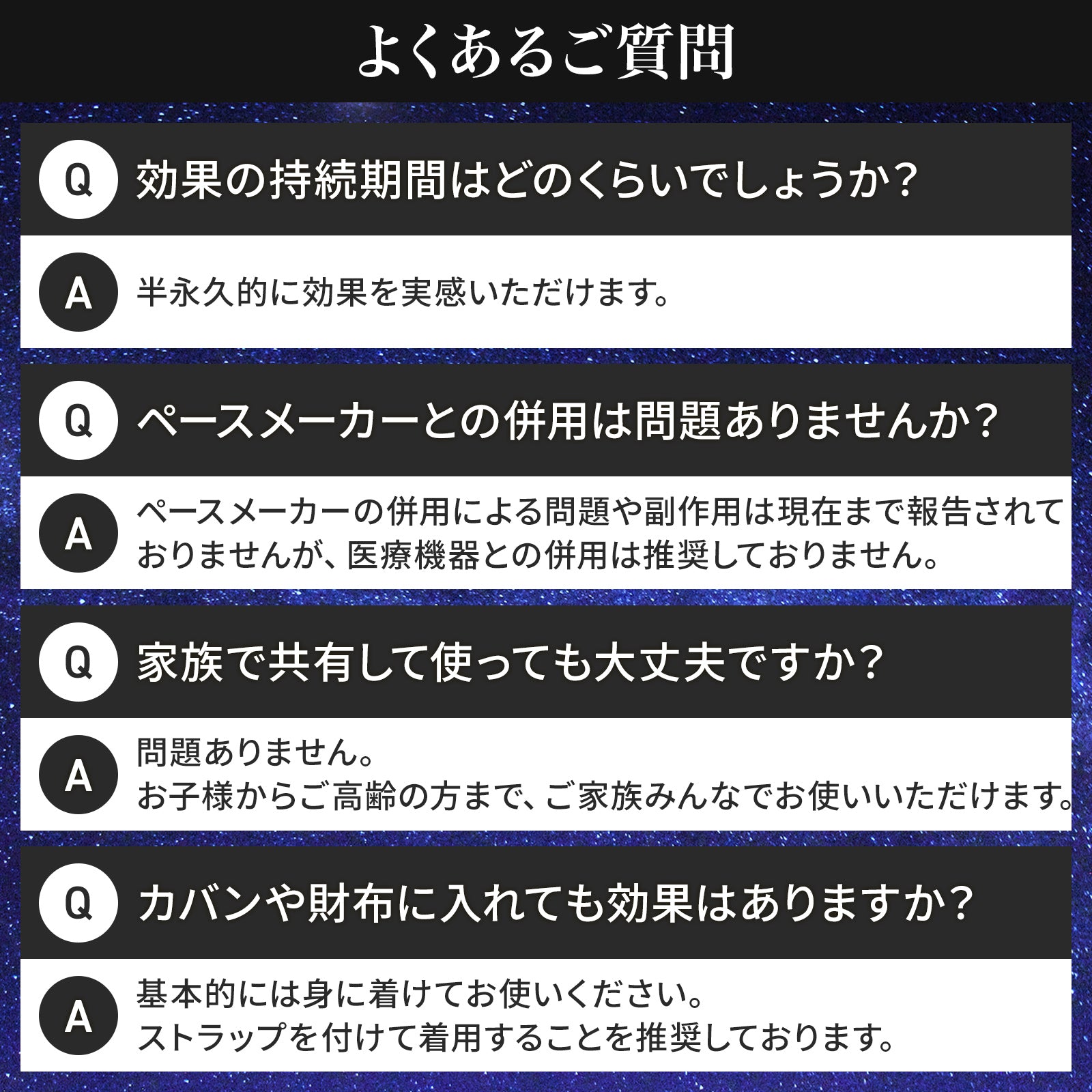 私(47歳)•••5日ほど身に付けていました。腰痛が結構辛かったのが痛みが弱くなりました。だいぶ楽です。足のむくみが無くなったと思います。ちなみに塩水にライフミネラルドロップ70を入れて飲んでいます。仕事したあとの疲れ方が違います。とっても楽です。まだ元気です。